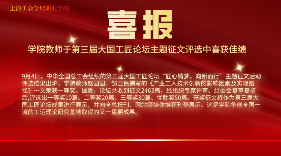 学院教师于首届大国工匠论坛主题征文、中国工运研究所工会史志理论研究征文评选中喜获佳绩